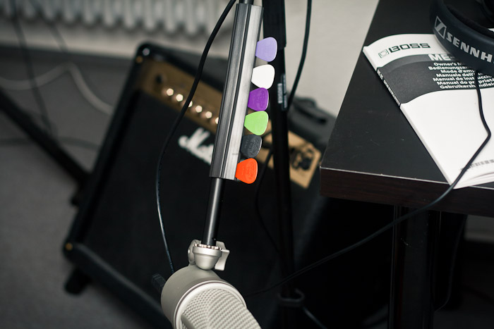 Bis heute hatte ich immer das Problem, das ich nie ein Plektrum zur Hand hatte, weil sie immer quer über den Boden verstreut waren. Doch glücklicherweise konnte ich mich endlich dazu durchringen ein Gerät zu kaufen, welches mir dabei hilft Ordnung zu halten: ein professionelles Plektren-an-Mikrofonständer-festmach-Ding.