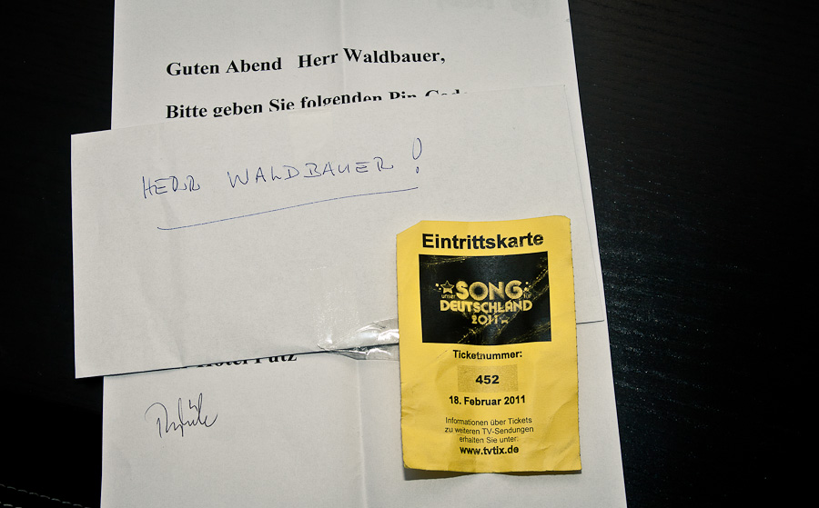 Dann ging die Show los. Dummer Einspieler, Lena singt, Jury spricht -- das ganze sechs mal. Und dann noch zweimal. Teilweise zog es sich etwas (die Einspieler zu den Song-Komponisten kannte man ja schon zu 90%), aber insgesamt war es doch cool. Vor allem war es soundtechnisch viel besser als am Fernseher. Und Lena hat auch (zumindest in meinem Hörgefühl) besser gesungen als in den Halbfinals. Achso. Und Adel Tawil hat noch gesungen, das war gut.
