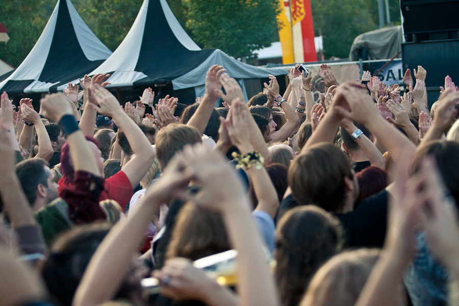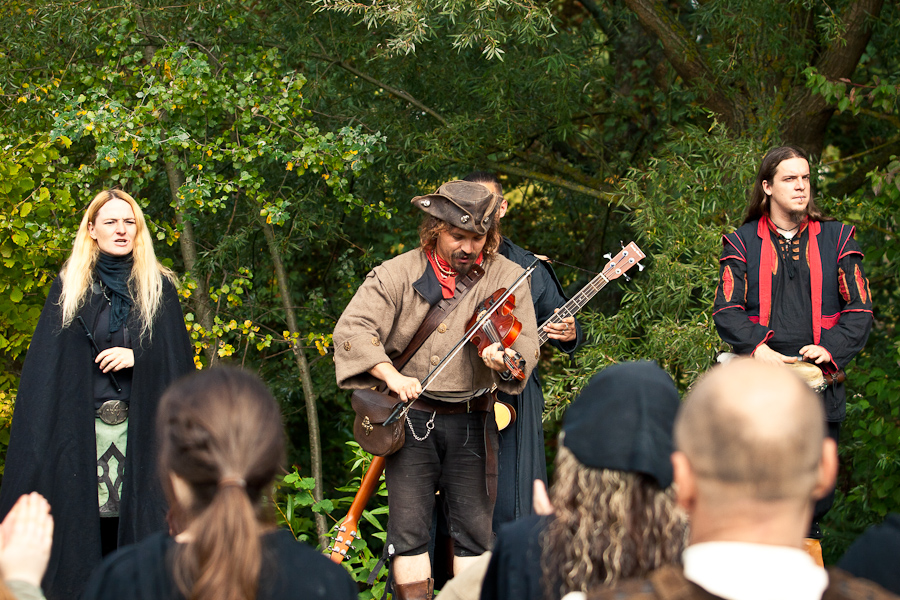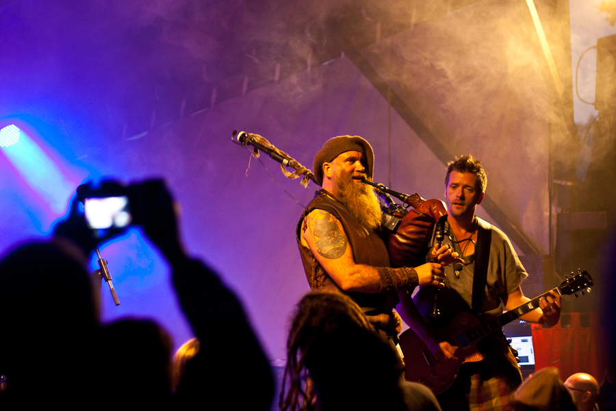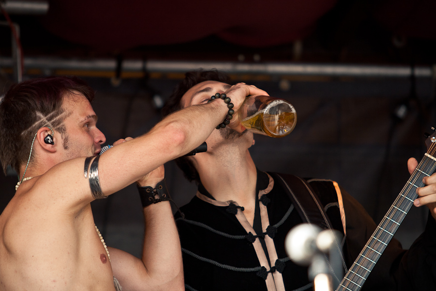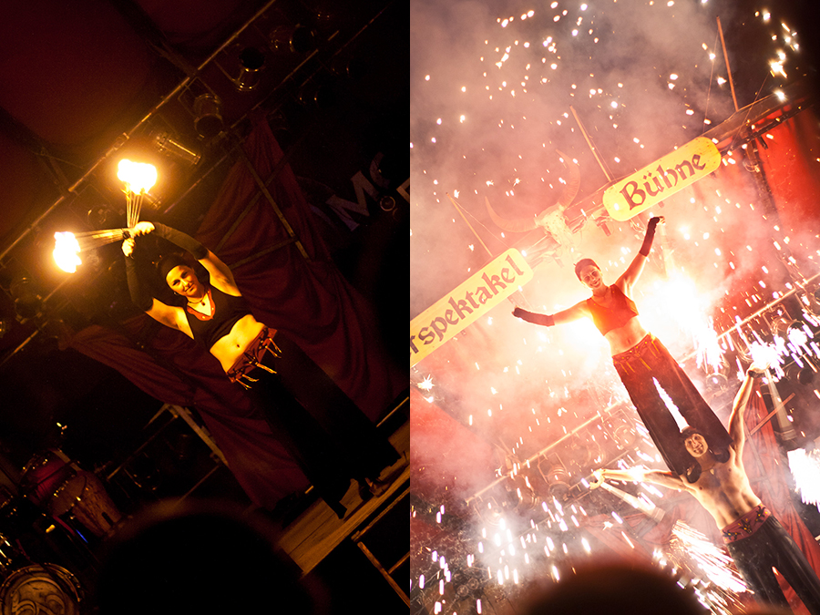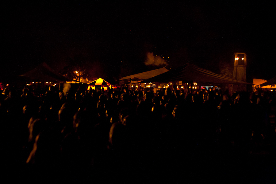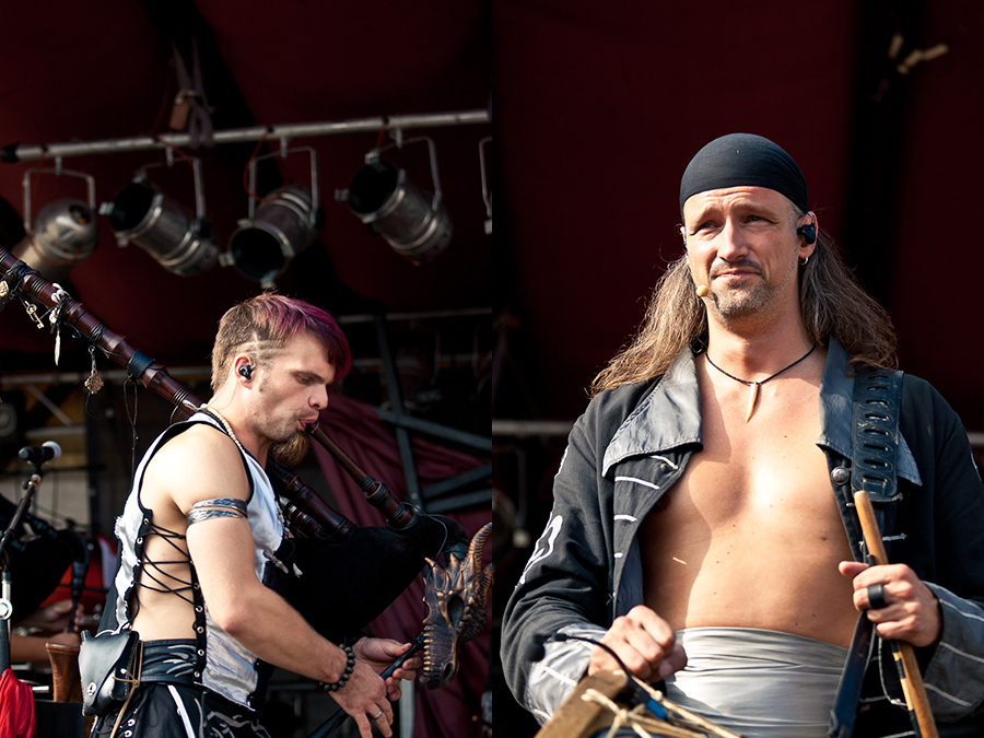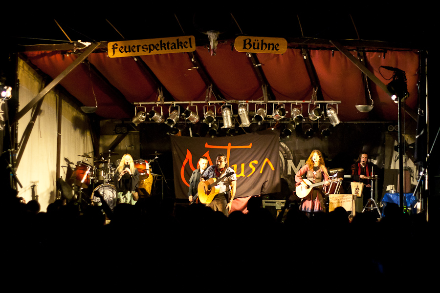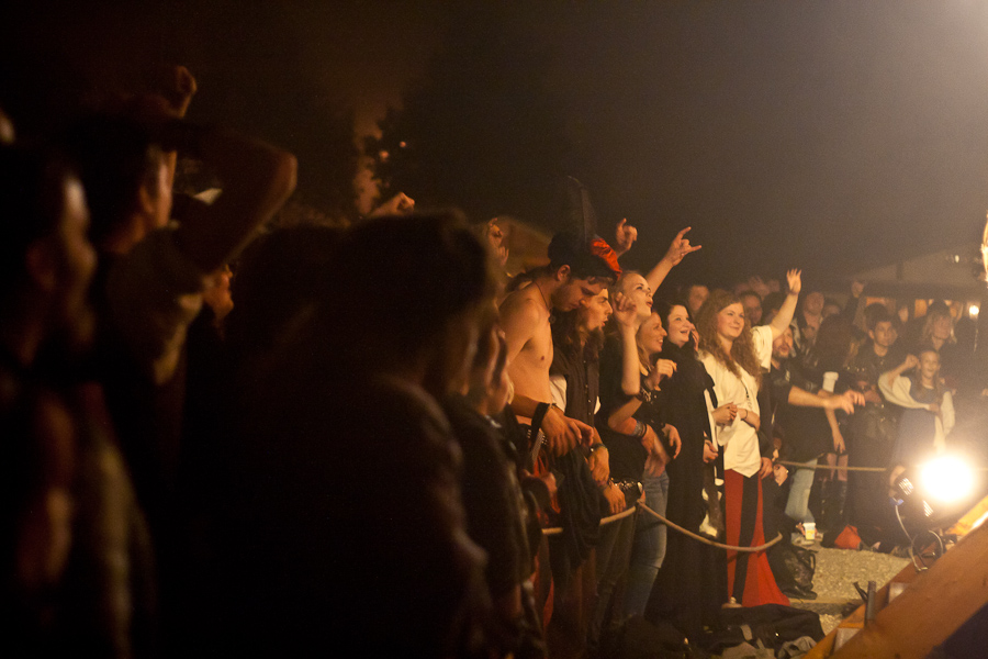 Leider wurde es dann auch schon dunkel, wir machten noch kurz Halt bei der anderen Bühne, wo gerad Saor Patrol spielten und bewegten uns dann langsam in Richtung der anderen Bühne, wo später die Feuershow stattfinden sollte. Vorher spielte da dann noch Metusa das Abendkonzert, wo sie etwas überzeugender waren als am Mittag.