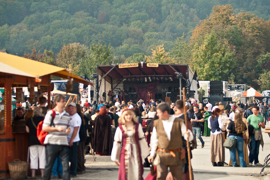 Als wir erstmal genug hatten ging es dann weiter zur Feuerspektakel-Bühne und über den 2. Teil des Geländes, wo es hauptsächlich Fressbuden gab. Ich gönnte mir ein Hähnchensteak-Brötchen, was ziemlich schmackhaft war. Gesättigt und etwas ausgeruht gingen wir dann zum Saltatio Mortis Auftritt, der ganz gut und lustig war.