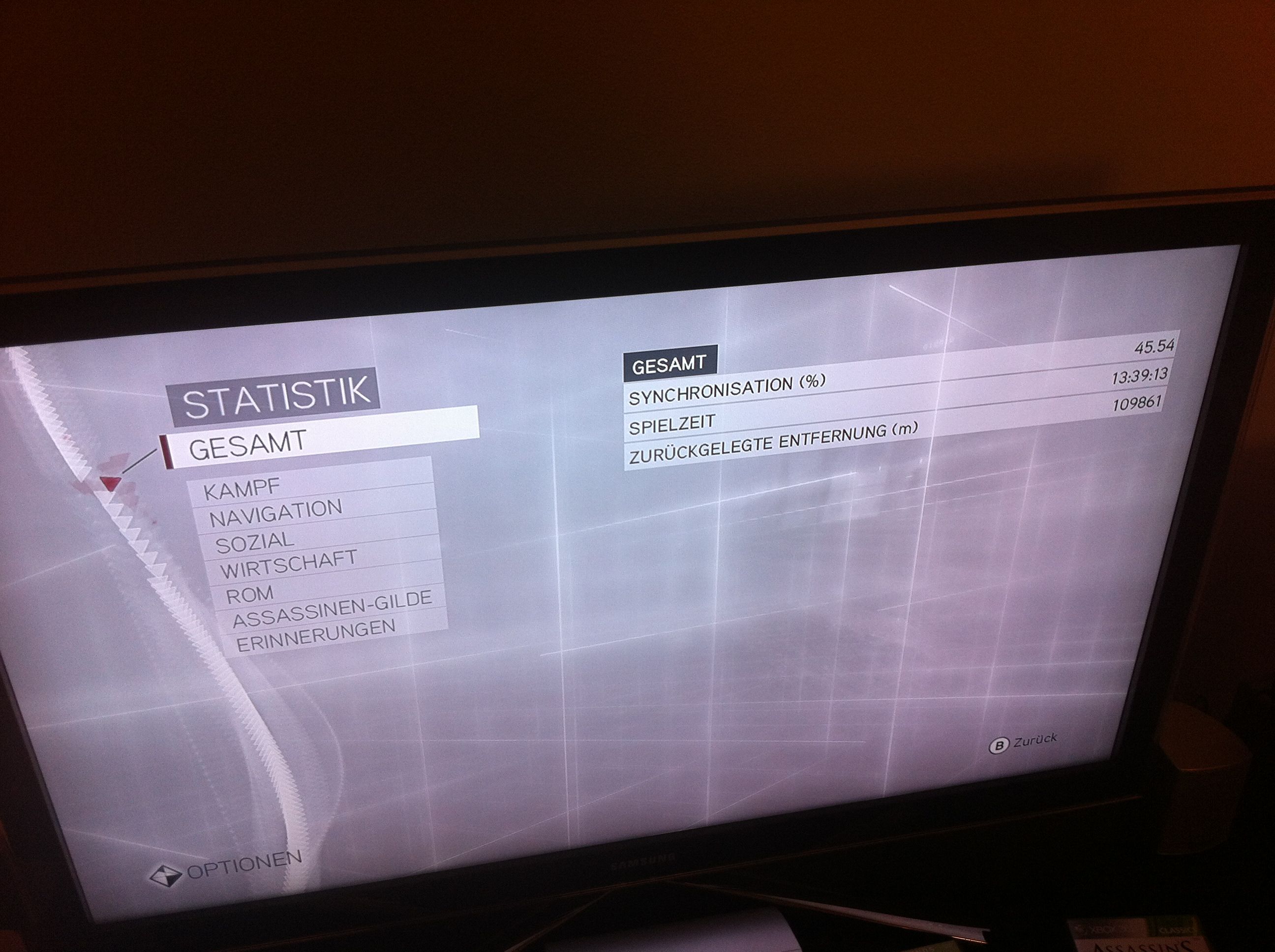Man könnte nun Argumentieren, dass ich das Spiel ja nich wirklich durch hab, wenn die Gesamtsynchronisation nur 45% beträgt. Ja, okay. Es gibt noch ein bisschen zu tun: Dämliche Attentatmissionen, dämliche Kurtisanenmissionen, dämliche Leonardo-Missionen ("Entdeckt werden führt zu Desynchronisation").