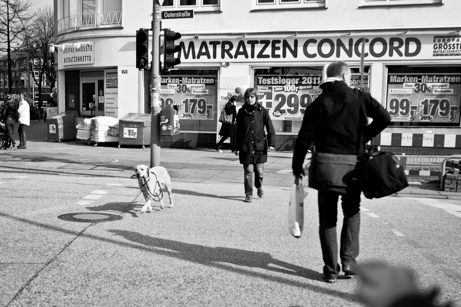 Hier, dieser Hund ist total out-of-focus, aber ich wollte ihn trotzdem zeigen, denn ich fand es total klasse, dass er sich selber an der Leine führt: