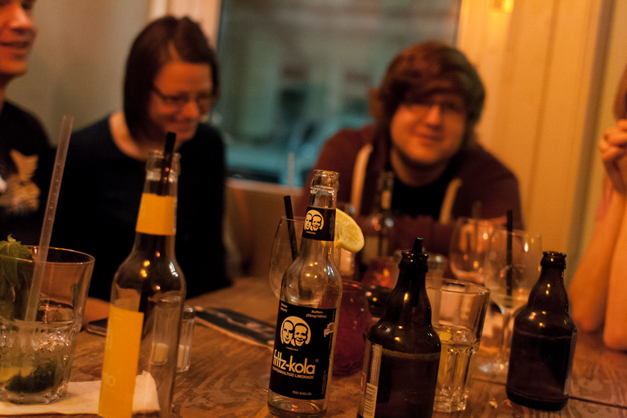 Wir gingen zum bok. Ich aß nichts, denn ich hatte ja gerade erst ein Sub gegessen, Sven wollte einen Frozen Joghurt, der leider ausverkauft war und die anderen aßen irgendetwas. Danach gingen wir ins Kaffee Stark. Glücklicherweise gab es dort noch genug Platz für unsere recht große Twittermenschengruppe. So verbrachten wir dann die verbleibenden Stunden des Freitags und die ersten Stunden des Samstags.