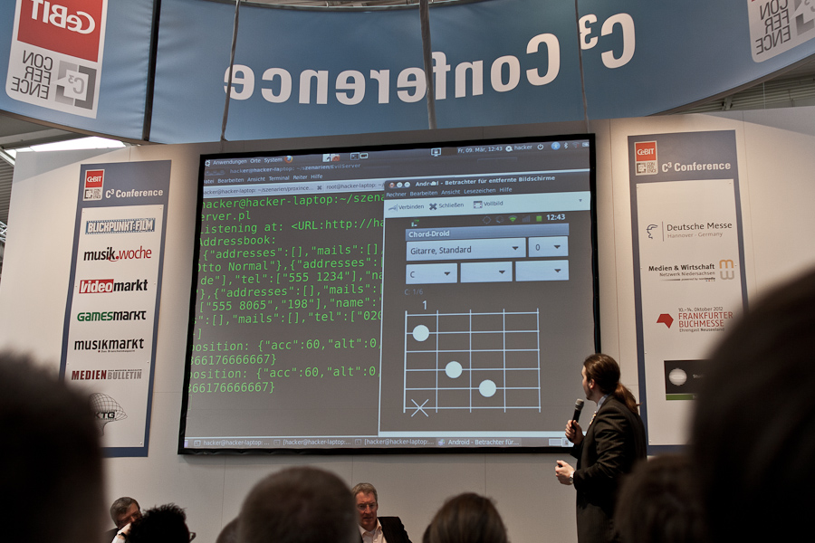 Bevor unser Panel anfing, begutachteten wir noch das "Live Hacking" Panel von so zwei Typen, die ganz sympatisch wirkten, aber irgendwie auch nur die übliche "Ohh, Smartphones sind voll unsicher"-Panikmache runterratterten.