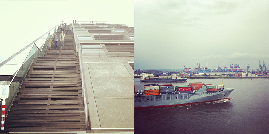 Froh, wieder festen Boden unter den Füßen zu haben, machten wir uns dann auf zu den Landungsbrücken um ein wenig Boot zu fahren. Man muss sein HVV-Ticket ja ordentlich ausnutzen. Wir fuhren also zwei Stationen zu den Docklands(?) und kamen dort auf die grandios bescheuerte Idee, dieses Pyramidenartige Gebäude mit etwa 10382018340 Treppenstufen hoch zu gehen. Das war dezent anstrengend.
