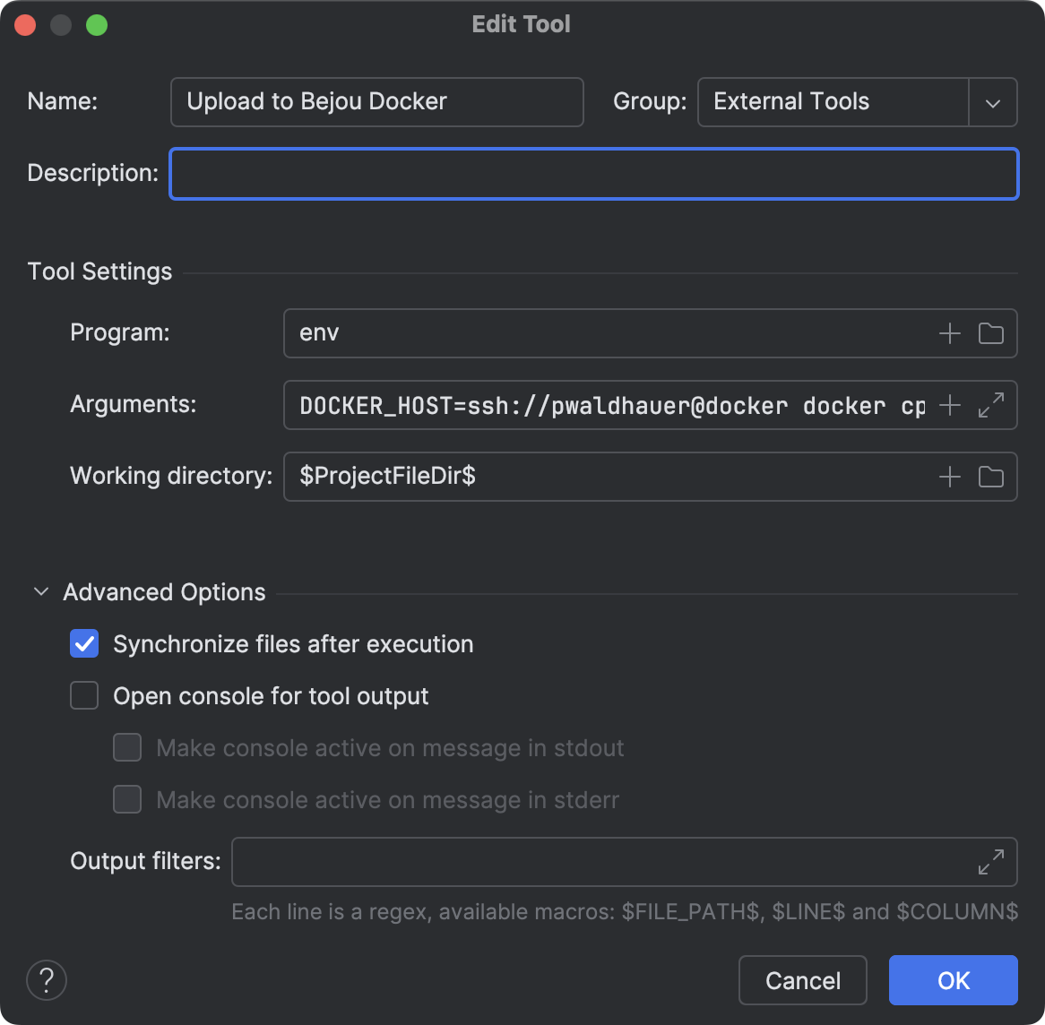 DOCKER_HOST=ssh://pwaldhauer@docker docker cp $FilePathRelativeToProjectRoot$ bejou-bejou-1:/app/$FilePathRelativeToProjectRoot$