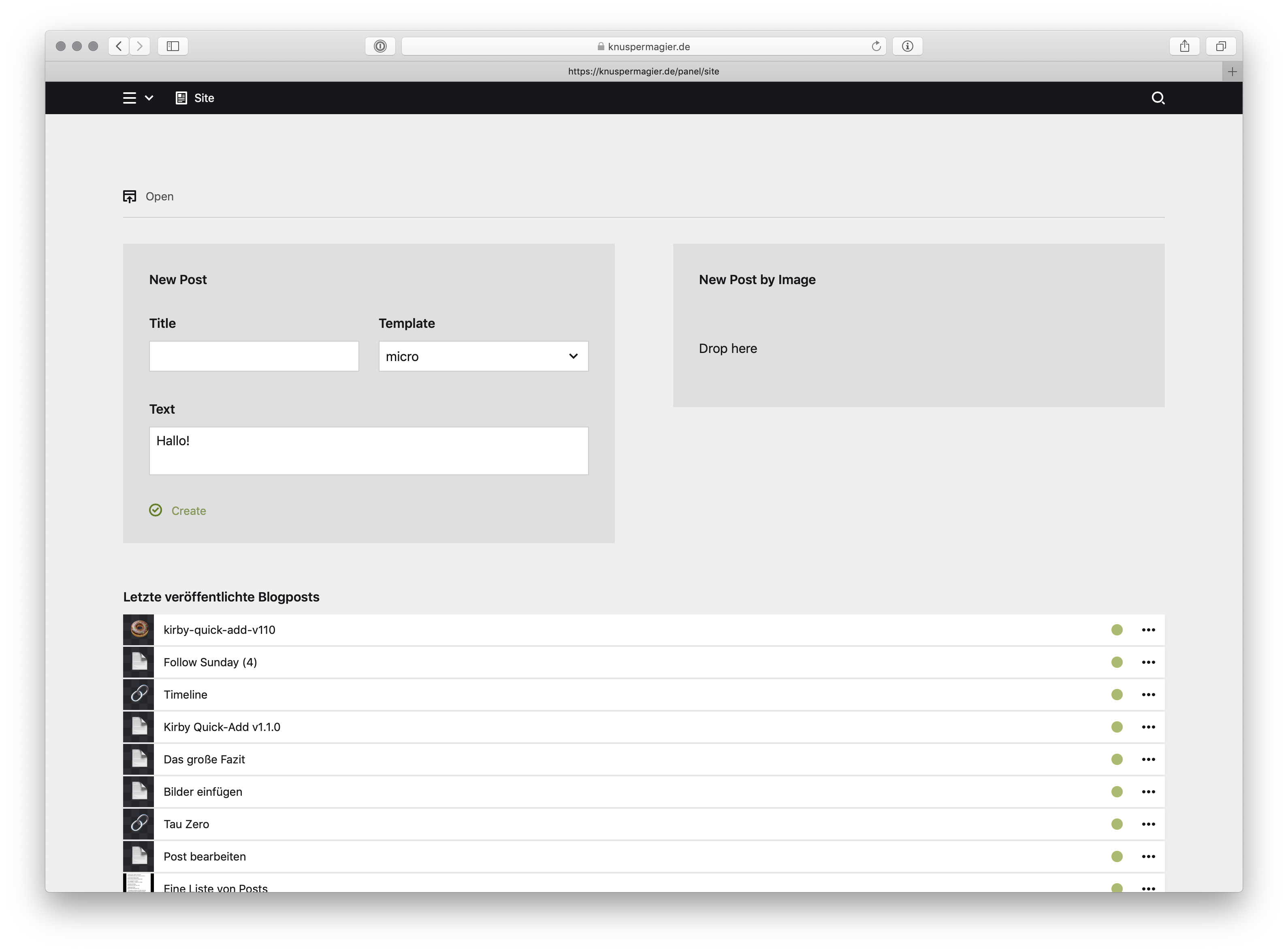 Ich benutze Kirby hauptsächlich als Blog-System. Das funktioniert an und für sich auch sehr gut, doch so manche Sache vermisste ich noch -- zum Beispiel die Möglichkeit wirklich schnell und unkompliziert neue Beiträge anzulegen. Dieses Kirby-Plugin bietet zwei `section`s, mit denen man das machen kann.
